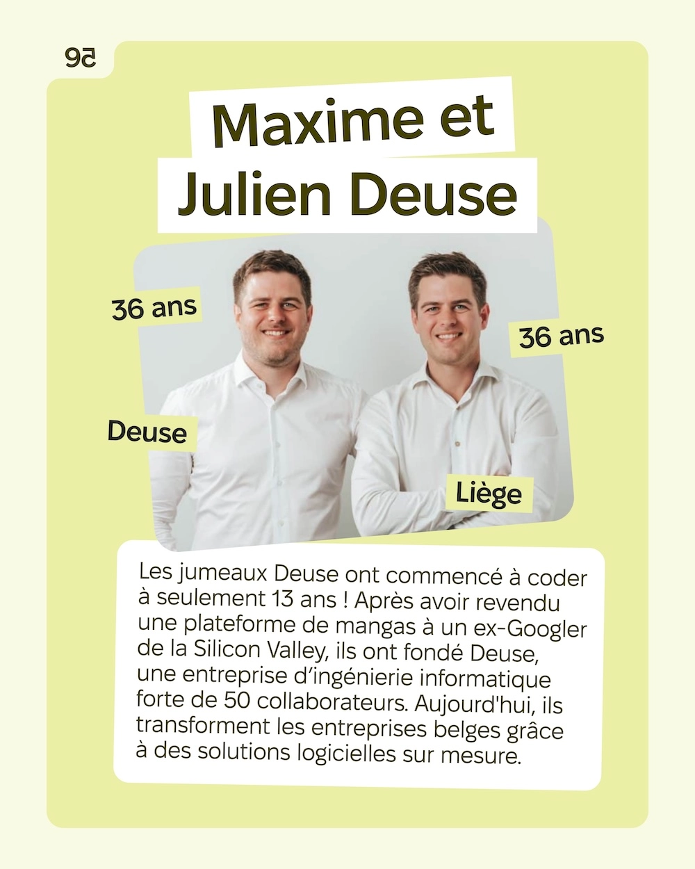 Ces jumeaux codent depuis leurs 13 ans. Après une première revente réussie dans la Silicon Valley, ils dirigent aujourd'hui Deuse, une boîte d'ingénierie informatique de 50 collaborateurs qui transforme les PME belges grâce au sur-mesure.