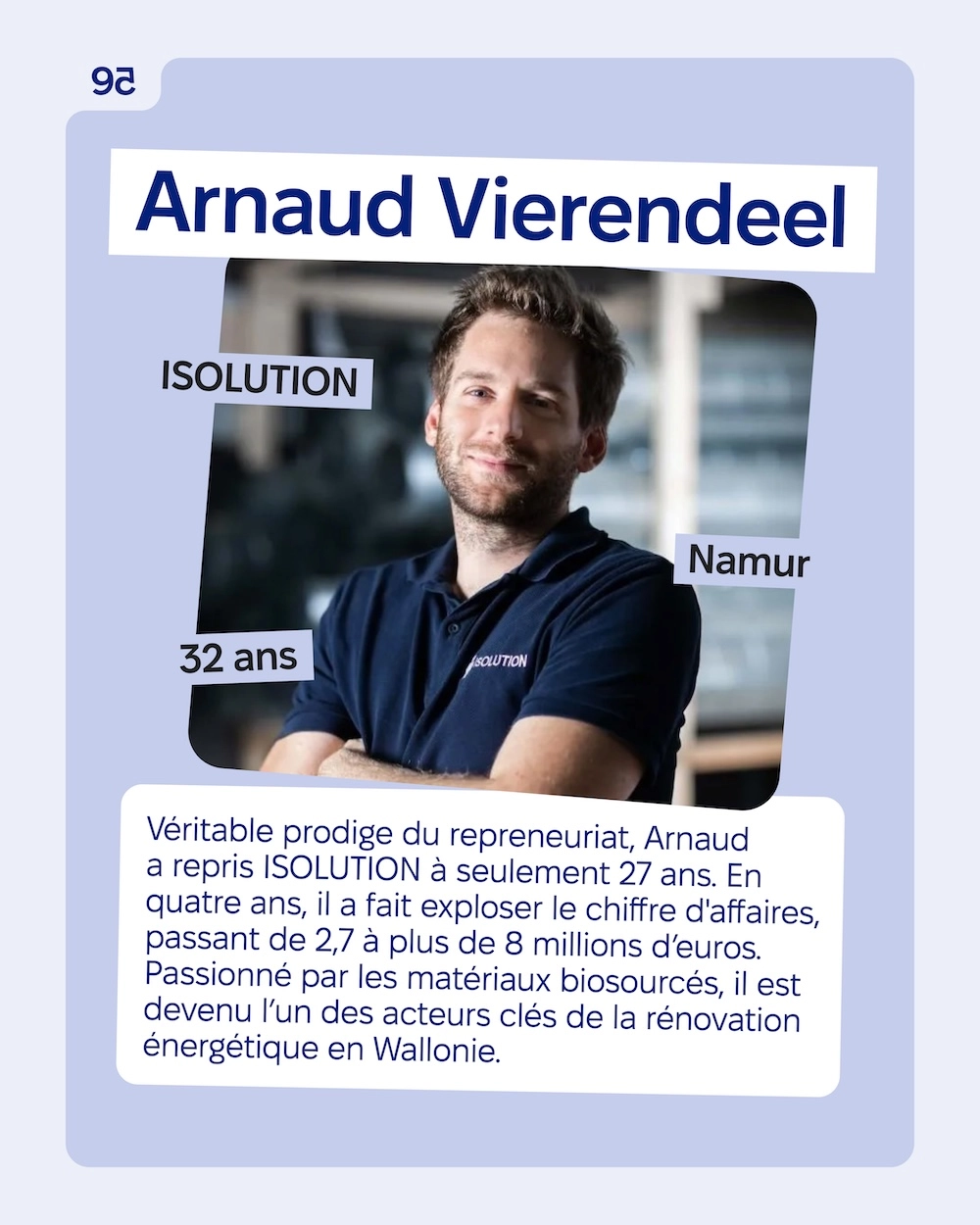 Prodige du repreneuriat, Arnaud a repris ISOLUTION à 27 ans. En quatre ans, il a fait grimper le CA de 2,7 à 8 millions d’euros. Il est aujourd'hui un acteur incontournable de la rénovation énergétique en Wallonie grâce aux matériaux biosourcés.