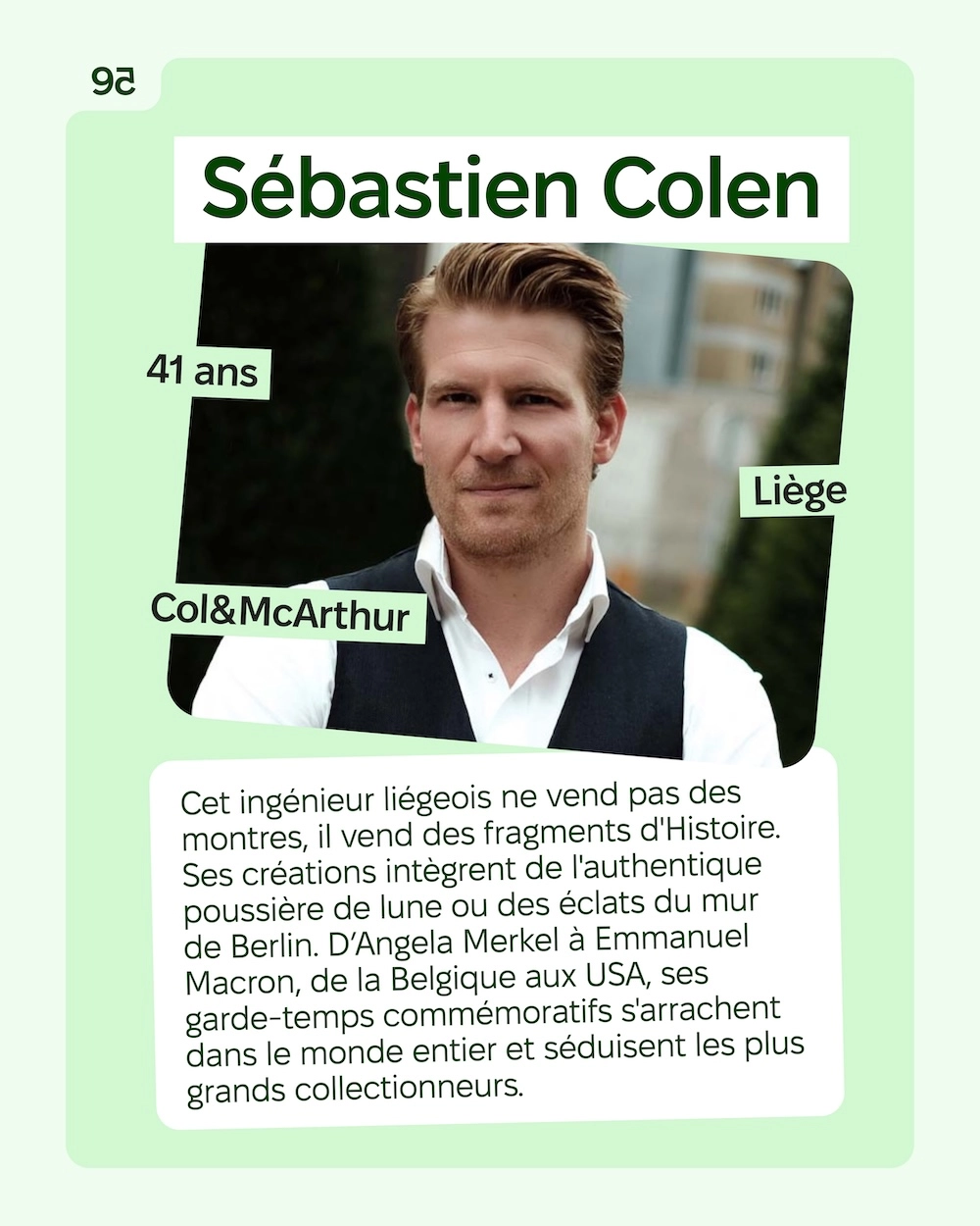 Sébastien ne vend pas de simples garde-temps, il vend des fragments d'Histoire. Ses montres intègrent de la poussière de lune ou des éclats du mur de Berlin. Ses créations s'arrachent de la Belgique aux USA, séduisant même des chefs d'État comme Emmanuel Macron.