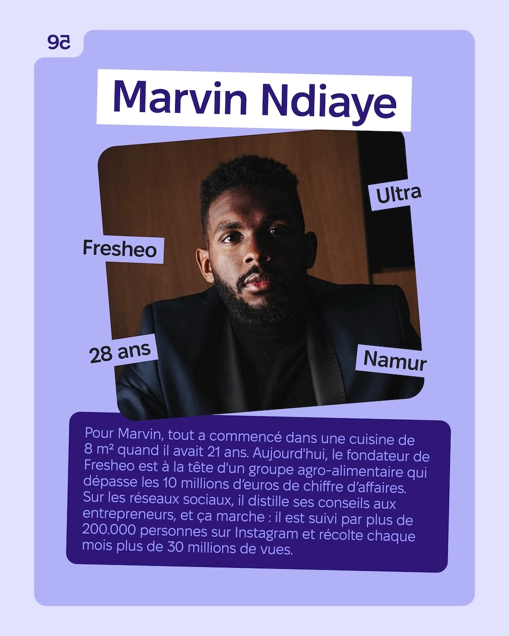 Parti d'une cuisine de 8 $m^2$ à 21 ans, Marvin est aujourd'hui à la tête d'un groupe agro-alimentaire dépassant les 10M€ de CA. Véritable star des réseaux sociaux, il cumule 30 millions de vues par mois en partageant ses conseils d'entrepreneur.
