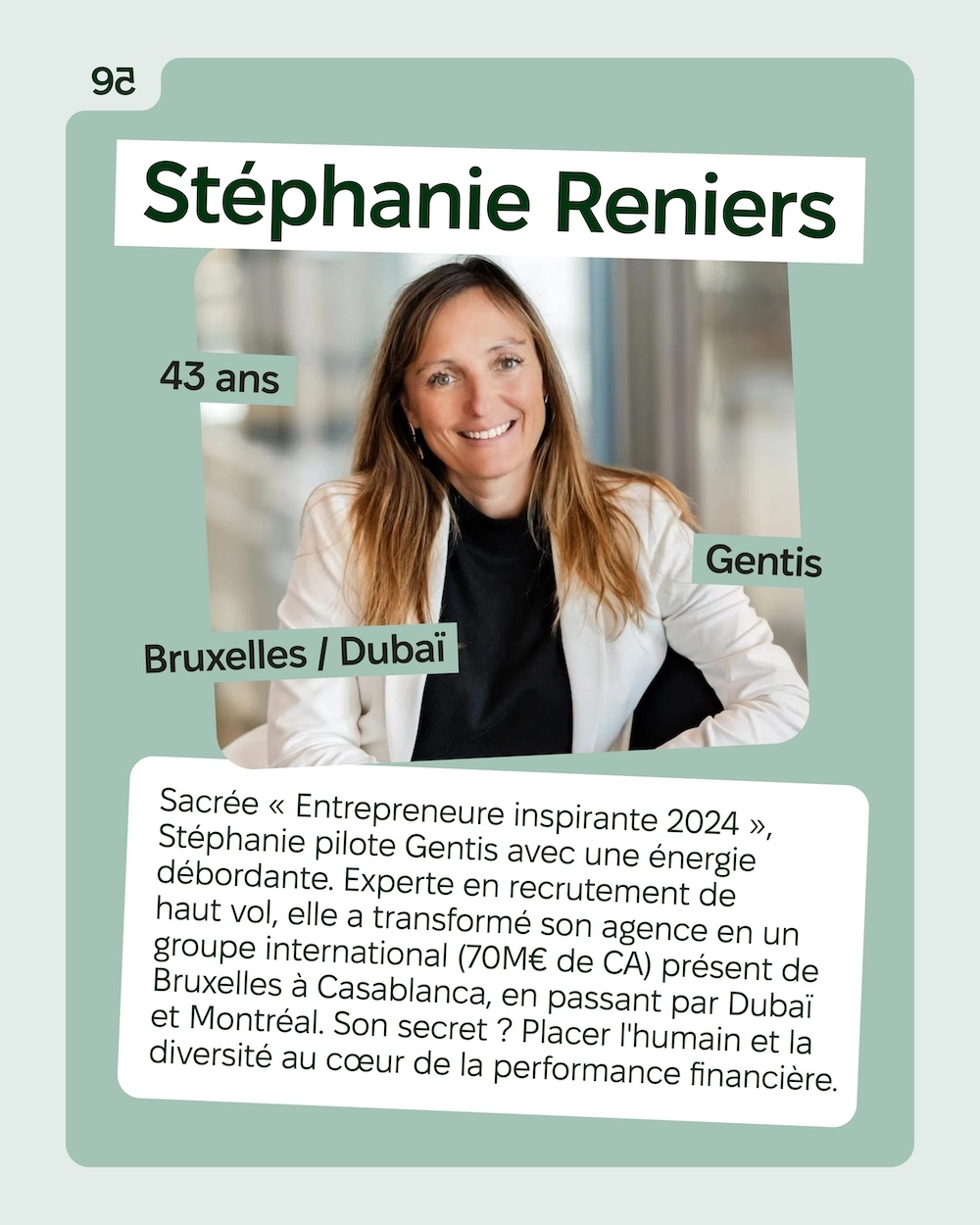 Élue "Entrepreneure inspirante 2024", Stéphanie pilote Gentis avec une énergie communicative. Elle a transformé son agence de recrutement en un groupe international de 70M€ de CA, présent de Bruxelles à Dubaï. Sa force ? Placer l'humain au cœur de la performance.