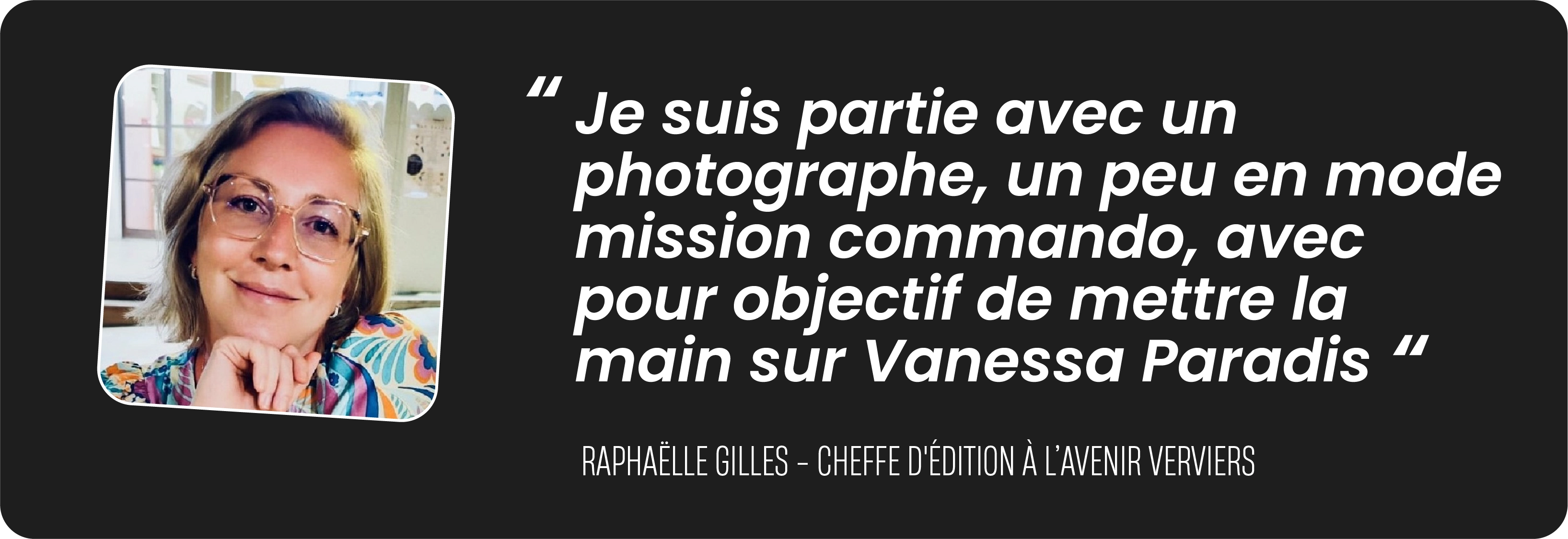 Oui, je parlais tout à l’heure des Francofolies de Spa… Eh bien, c’était justement là. Vanessa Paradis venait en concert, et je me souviens que mon chef d’édition de l’époque m’avait dit : « Elle arrive à telle heure à la gare des Guillemins, va la chercher, va la trouver ». Je suis donc partie avec un photographe, un peu en mode mission commando, avec pour objectif de mettre la main sur Vanessa Paradis. Je l’ai effectivement trouvée, mais elle était entourée d’un service de sécurité bien musclé. Pas moyen d’échanger un mot, encore moins de lui poser une question. Je précise quand même qu’elle était sans Johnny Depp (rires).