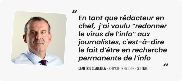 Le rédacteur en chef est le garant de la ligne éditoriale, je dois donc faire les bons choix et mettre en place les bonnes stratégies pour faire évoluer le média. Avec l’aide d’autres rédacteurs, j’ai construit une nouvelle ligne éditoriale pour Sudinfo, toujours en priorisant ce côté proximité, mais en essayant de gagner en crédibilité et en investissant dans la déontologie. Je me suis concentré sur l’actualité, la politique et le sport local tout en développant le digital.
