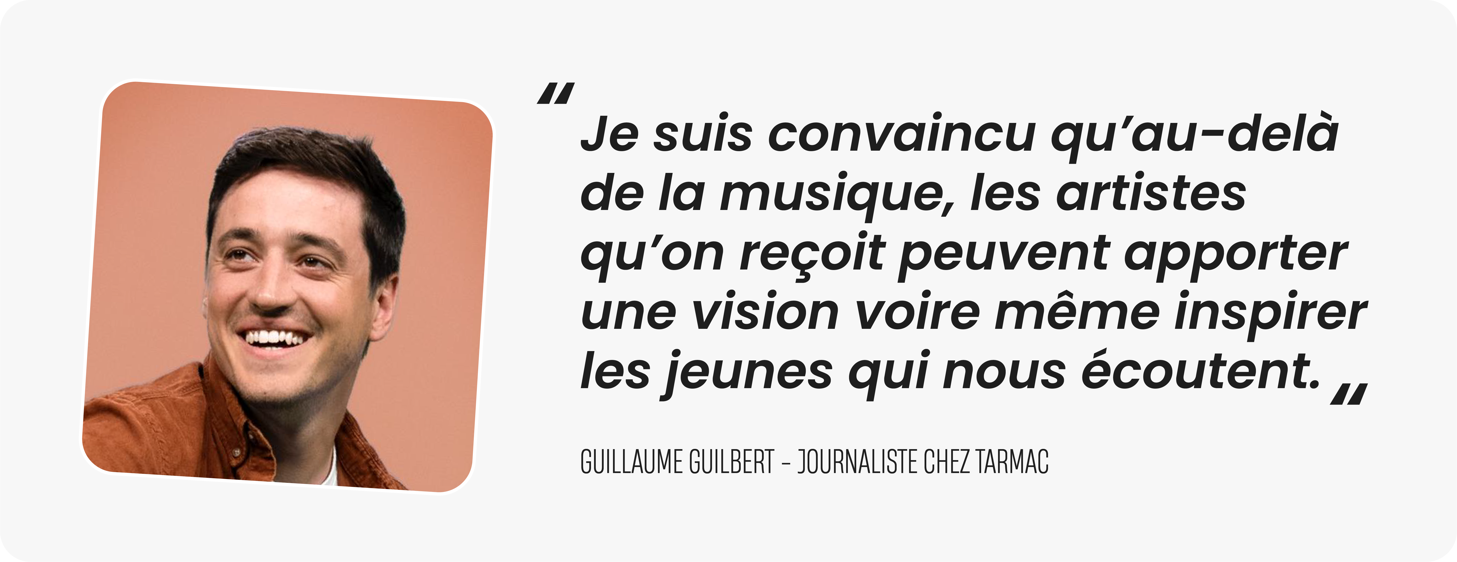 À côté de ça, je produis moi-même du contenu, notamment des interviews d’artistes dans le cadre de leurs sorties de projets. Et dans ce cas-là, je dois évidemment écouter l’album, m’intéresser à l’invité (vie perso, carrière, discographie, etc.) et préparer les questions plus inspirantes pour notre jeune public (15-25 ans). Je suis convaincu qu’au-delà de la musique, les artistes qu’on reçoit peuvent apporter une vision voire même inspirer les jeunes qui nous écoutent.