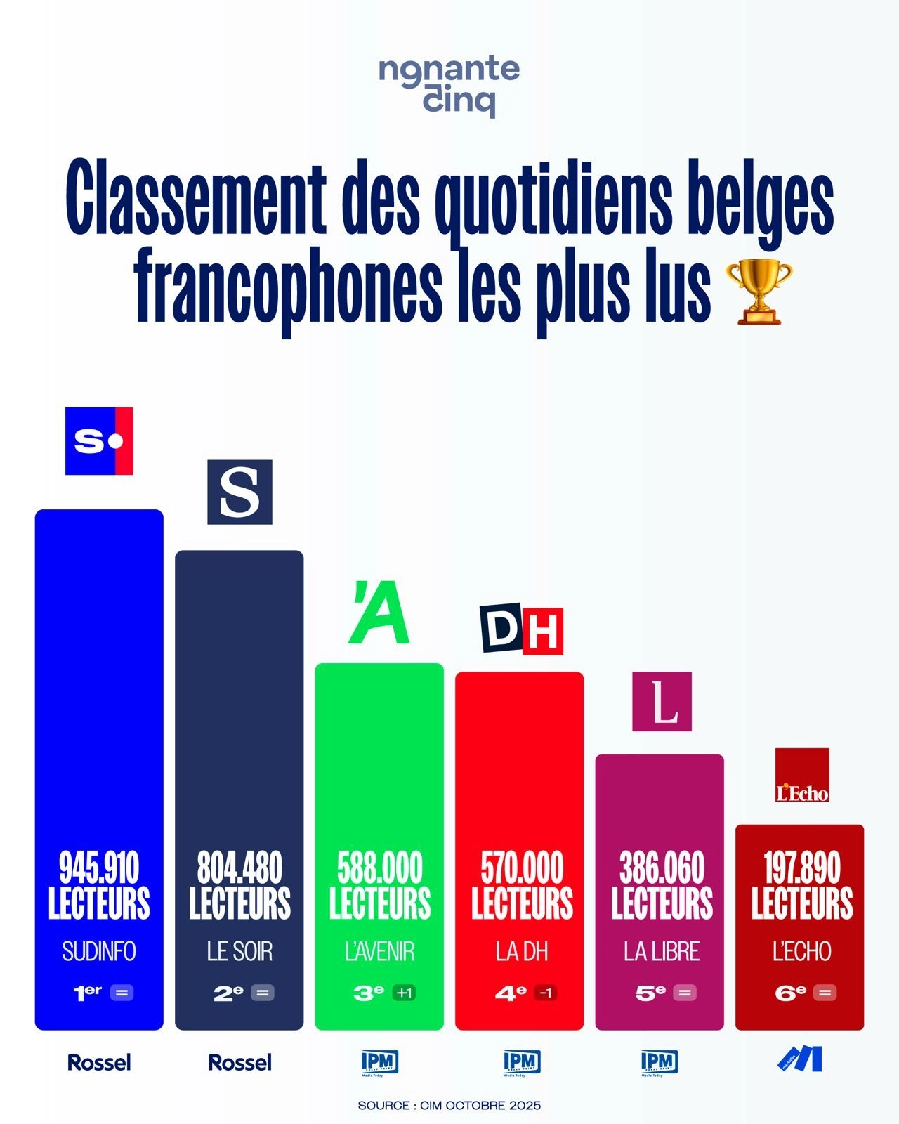 Avec 945.910 lecteurs quotidiens (chiffres "Brand" combinant papier et numérique), Sudinfo frôle la barre symbolique du million. C'est le média de proximité par excellence, ancré dans le quotidien des Wallons et des Bruxellois.