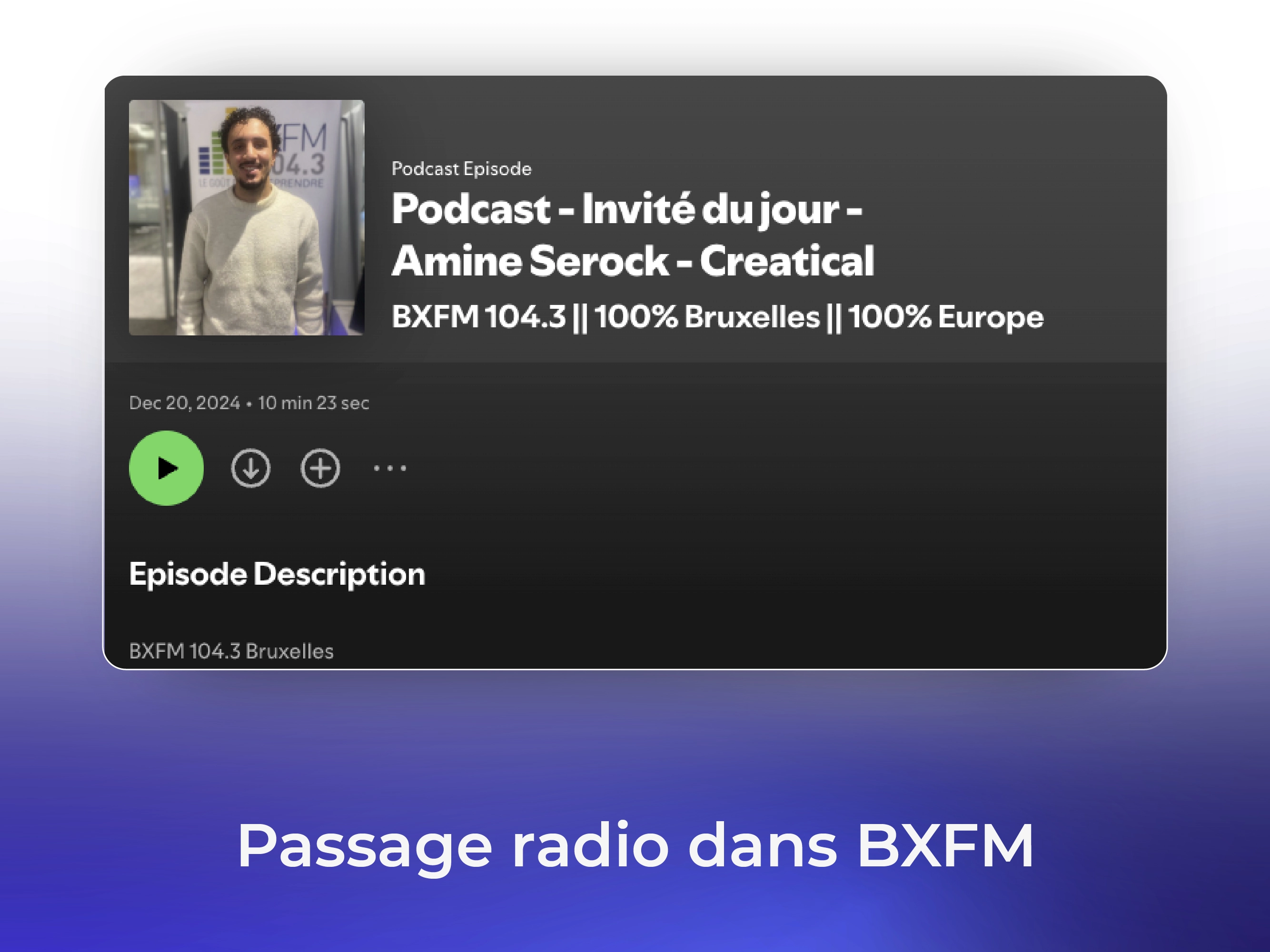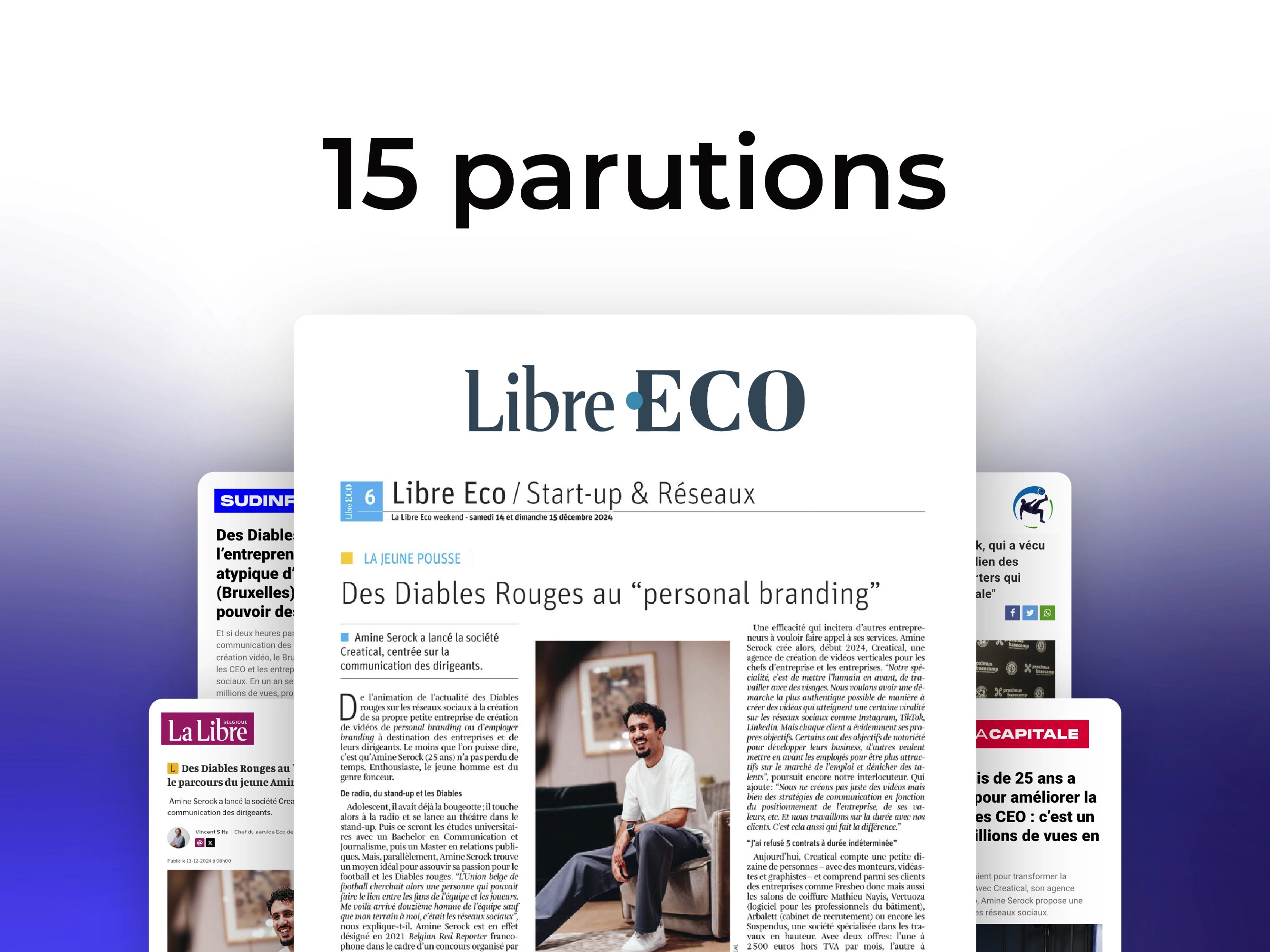 Mais Creatical n'est pas la seule corde à l'arc d'Amine ! Il a également été reporter pour les Diables Rouges. Fort de son parcours, il nous a contacté afin de développer son impact médiatique. Nous avons donc lancé diverses campagne de relations publiques qui, en plus de 25 parutions dans de nombreux médias différents (La Capitale, La Libre, La Libre Eco, Sudinfo, PUB, Trends-Tendances, BX1, etc.), lui a valu de recevoir le prix de "Bruxellois de l'année" 2024 !