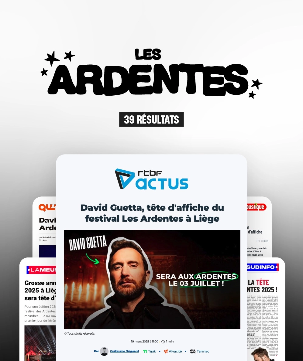 Comme vous le savez, on ADORE la musique. On fut donc enchantés de commencer à travailler sur leurs relations publiques, pour annoncer à travers une action coup de poing l'une des têtes d'affiche de 2025 : nul autre que la superstar française David Guetta. Connu pour offrir des shows ultra-calibrés sur toutes les plus grosses scènes du monde, nul doute qu'il retournera le public des Ardentes le 3 juillet prochain.