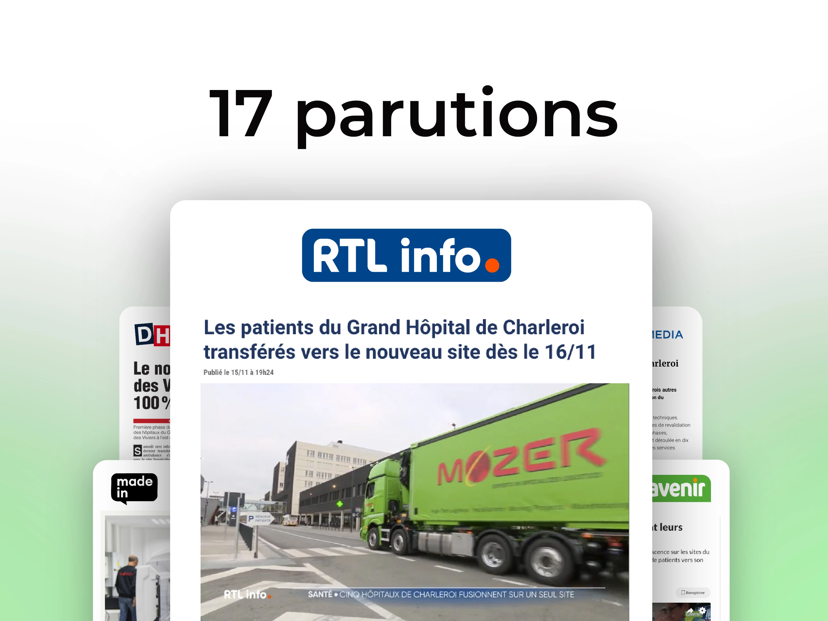 En novembre 2014, le Grand Hôpital de Charleroi a amorcé son déménagement avec Mozer en chef d’orchestre, l’entreprise liégeoise experte en la matière. Sollicités par l'entreprise afin de la mettre en lumière, nous avons lancé une campagne de relations publiques pour communiquer sur cette information, ce qui nous a valu 15 parutions dans 11 médias différents : RTL TVI, L'Avenir, La DH, RTL info, Sudinfo, CCI Mag, etc.