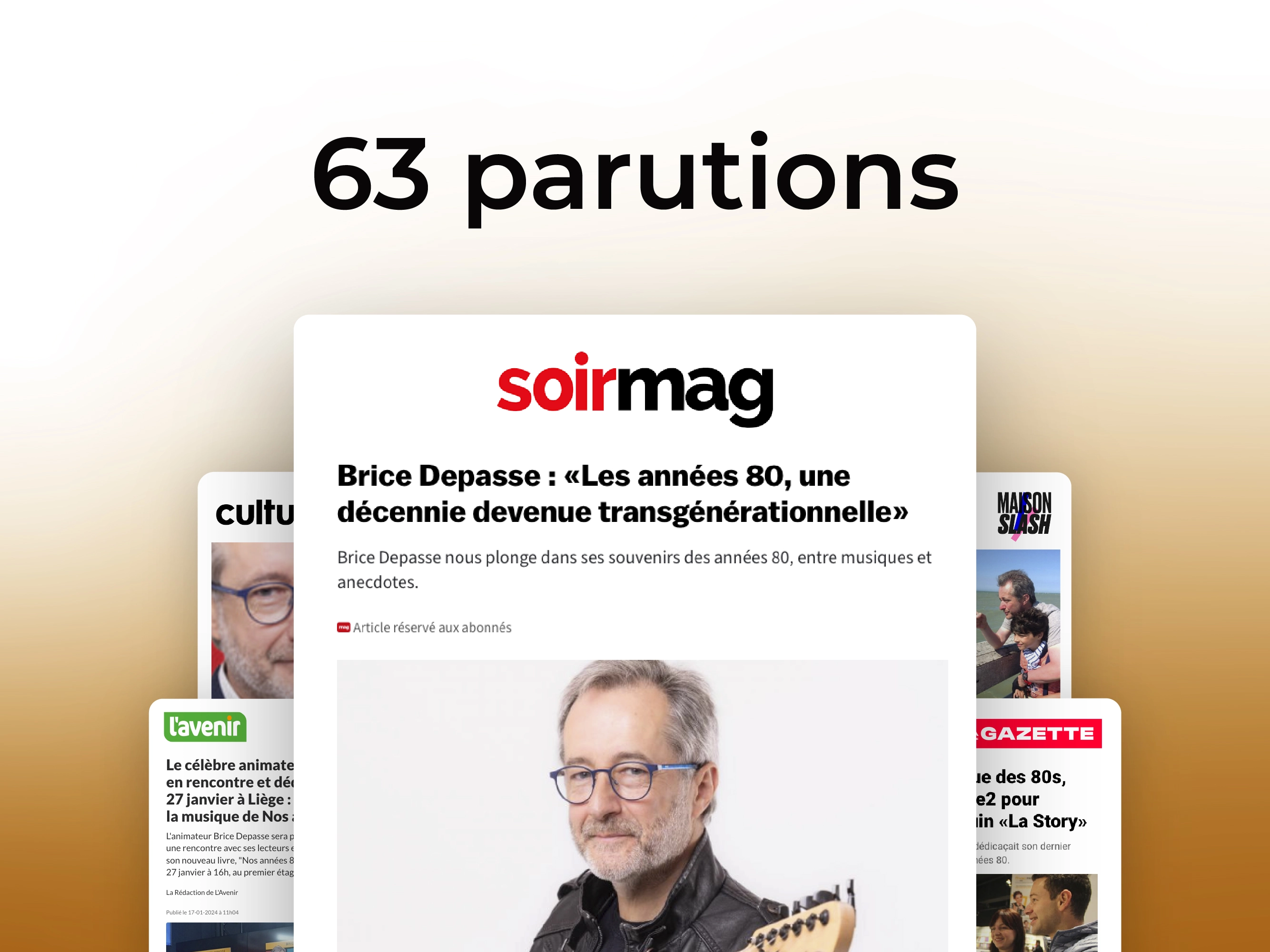 Brice Depasse, célèbre animateur de "La Story" sur Nostalgie, a publié un livre sur les eighties: « Nos années 80 ». Nous nous sommes occupés de la campagne pour en faire la promotion dans tous les médias et ce que l'on peut dire, c'est que le succès fut au rendez-vous, avec plus de 60 parutions, dans 34 médias différents : Ciné Télé Revue, Sudinfo, Soir Mag, L'Avenir, La DH, PUB, BX1, Pickx, LN24, So Soir, Le Soir, etc.
