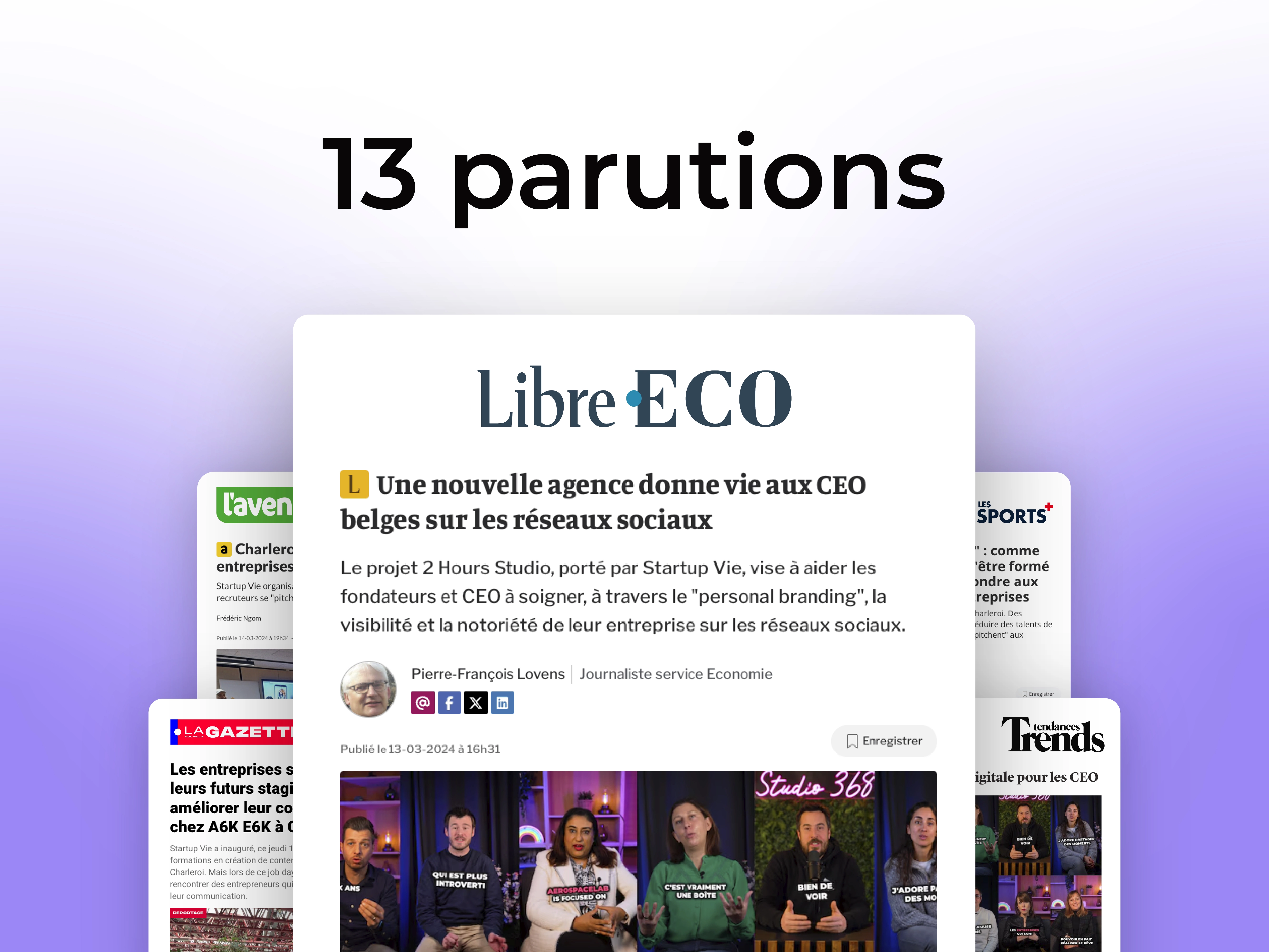 Le lancement de leur nouvelle agence "2 Hours Studio", visant à développer le personal branding des CEO pour accroitre leur visibilité, fut particulièrement challengeant. L'agence partait de zéro, nous avons envoyé notre premier communiqué le premier jour de son lancement. Bref, tout était à construire ! Et ce que l'on peut dire, c'est que les médias, notamment les spécialisés, se sont montrés intéressés de couvrir l'info, à commencer par PUB, Trends-Tendances, mais aussi La Libre.