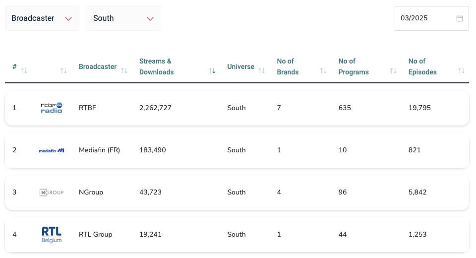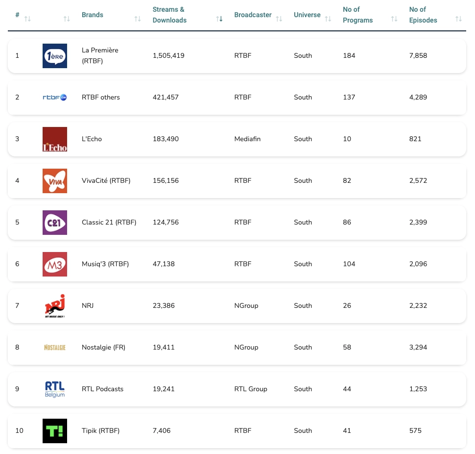 This dominance is due to its multiple brands (La Première, Classic 21, VivaCité, Musiq3, etc.) and its vast number of podcasts, particularly on La Première—188 different ones, in fact! RTBF produces an enormous amount of content.