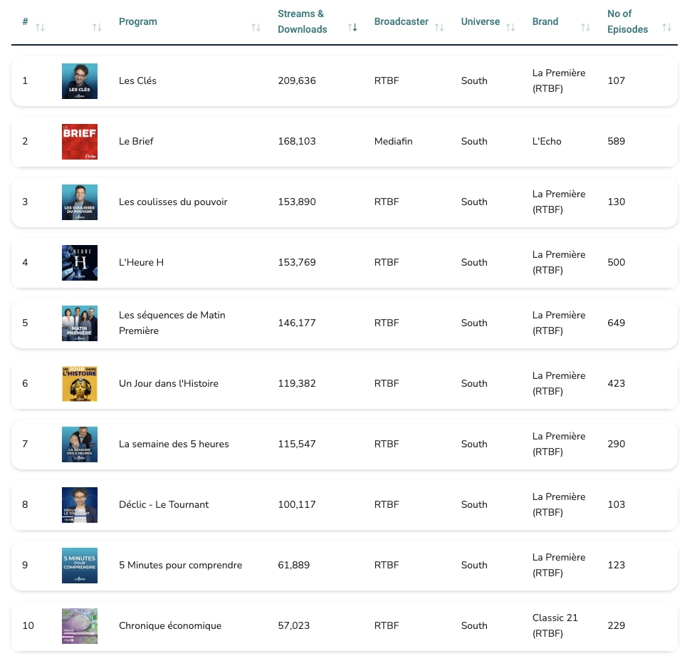 When it comes to broadcasters, the results are clear: RTBF clearly dominates the rankings. Apart from Mediafin, which takes second place with “Le Brief,” RTBF is only overtaken again in 25th place by Mediafin with “Tracker,” then in 29th by NGroup for NRJ content, followed by RTL in 30th with a program from RTL Podcasts. After that, RTBF regains its near-monopoly.