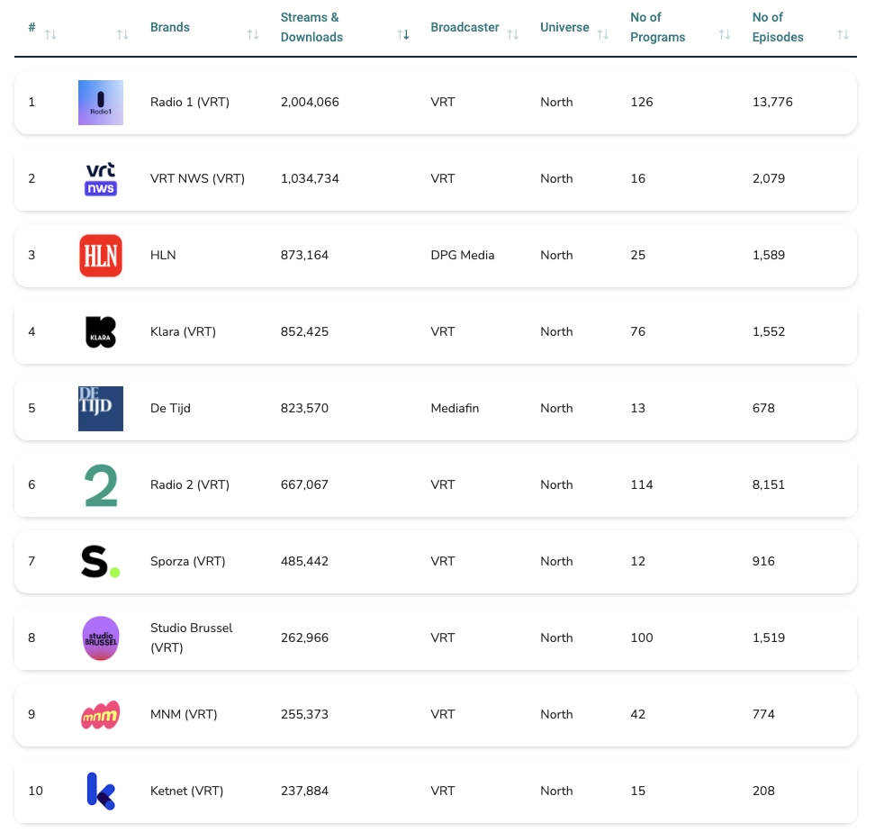 • Radio 1 (VRT), with 2,004,066 streams spread across 126 programs and 13,776 episodes.