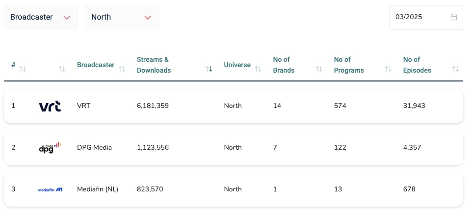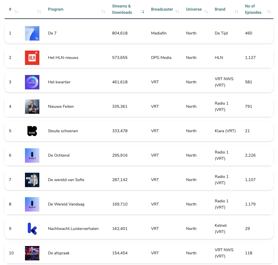 • VRT NWS (VRT), with 1,034,734 streams across 16 programs and 2,079 episodes.