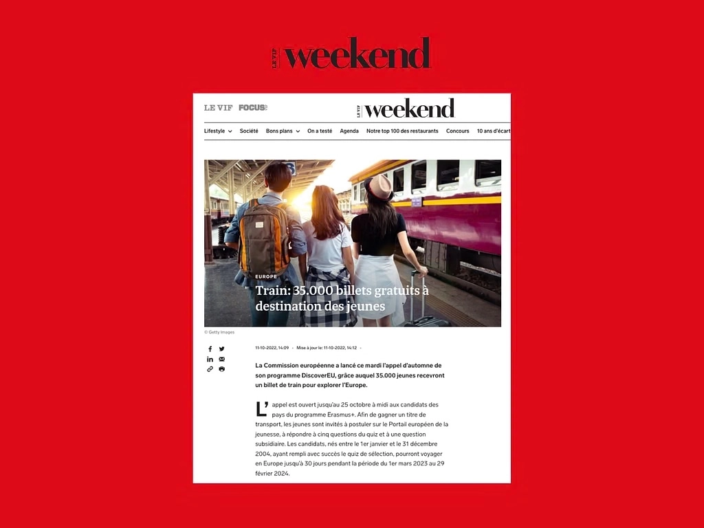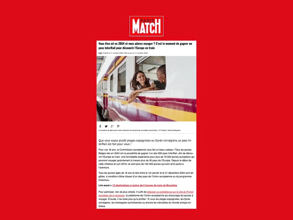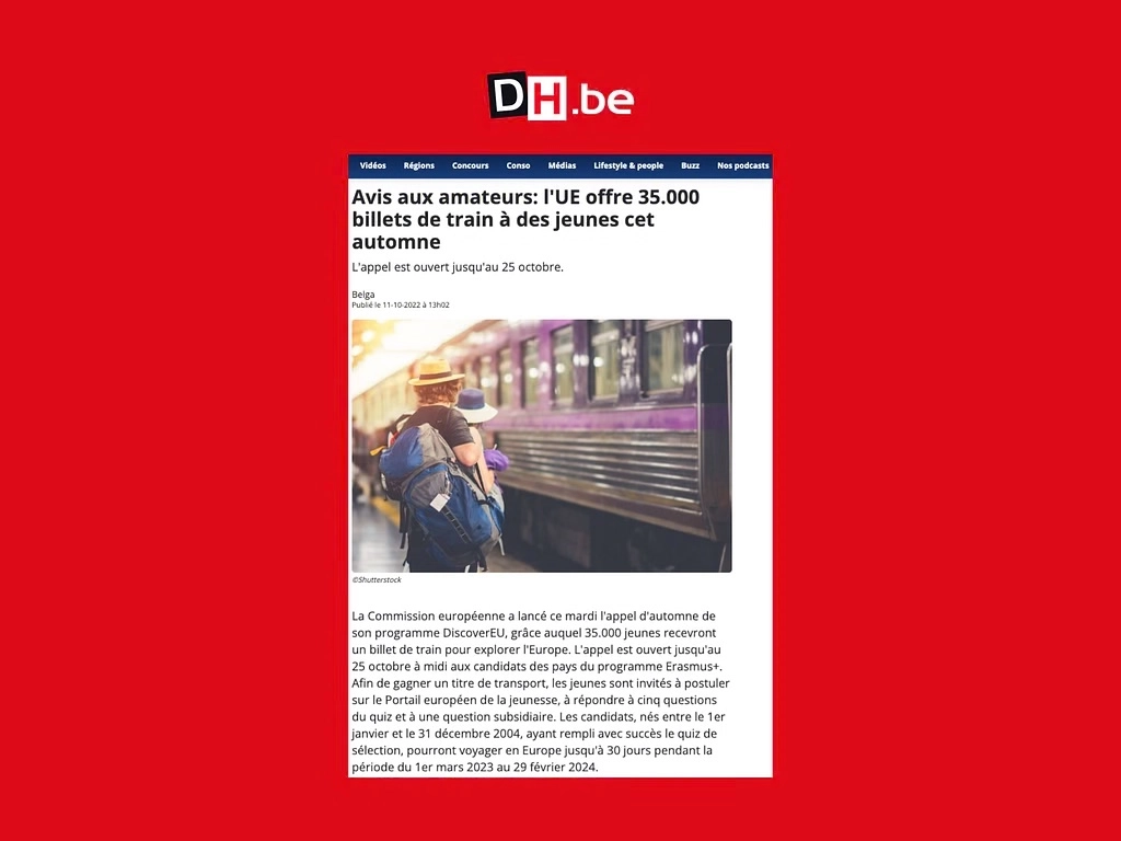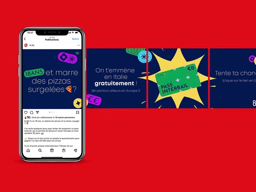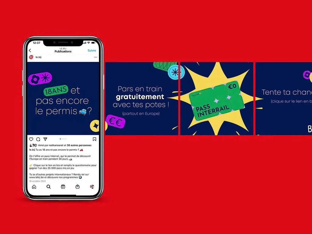 Le BIJ a fait appel à nos services pour assurer la mise en place d’une action visant à promouvoir leur programme annuel DiscoverEU auprès des jeunes de 18 ans en Belgique francophone. Cette campagne avait pour but d’augmenter le nombre de participants à un concours permettant de gagner des pass Interrail d’une valeur de 300€. Nous avons décliné notre travail en plusieurs axes : campagne de relations publiques, campagnes créatives diffusées sur les réseaux sociaux et réalisation d'un audit digital.